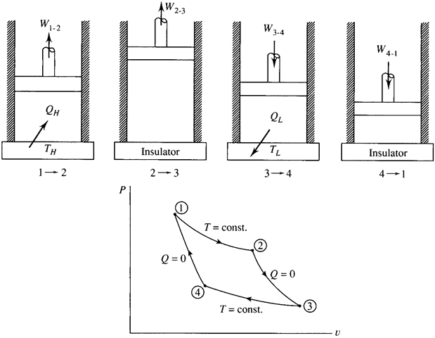 The cycle associated with the Carnot engine is shown in Fig. 5.6, using an ideal gas as the working substance. It is composed of the following four reversible processes: