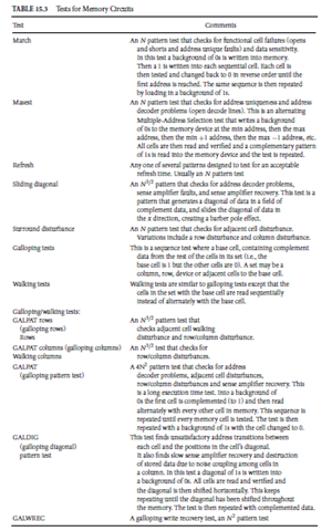 Special tests are needed for memory devices to insure the integrity of every memory bit location. These functional tests are composed of four basic tests, pattern tests, background tests, timing test, and voltage level tests. A summary of these tests is contained in Table 15.3.