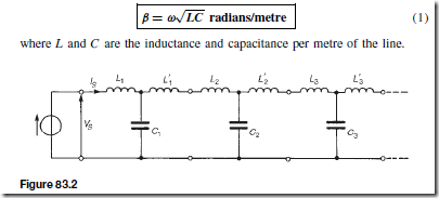 Since the line shown in Figure 83.2 is a ladder network of low-pass T-section filters, it may be shown that the phase delay, ˇ, is given by: